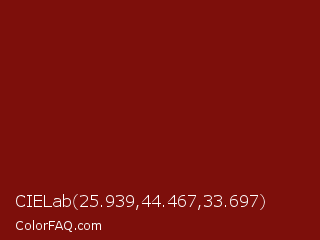 CIELab 25.939,44.467,33.697 Color is a dark red color and the nearest color is UP Maroon #7b1113. Hex code #7d0f0b and RGB value is rgb(125,15,11). In RGB color space, this color is composed of 49% red, 6% green, 4% blue, In CMYK color space, this color is composed of 0% cyan, 88% magenta, 91% yellow , 51% black , In HSL color space, this color has a hue angle of 2° , 84% saturation and 27% lightness.