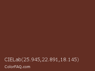 CIELab 25.945,22.891,18.145 Color is a dark red color and the nearest color is Liver Organ #6c2e1f. Hex code #632e23 and RGB value is rgb(99,46,35). In RGB color space, this color is composed of 39% red, 18% green, 14% blue, In CMYK color space, this color is composed of 0% cyan, 54% magenta, 65% yellow , 61% black , In HSL color space, this color has a hue angle of 10° , 48% saturation and 26% lightness.