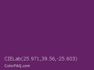 CIELab 25.971,39.56,-25.603 Color is a dark magenta color and the nearest color is Palatinate Purple #682860. Hex code #642165 and RGB value is rgb(100,33,101). In RGB color space, this color is composed of 39% red, 13% green, 40% blue, In CMYK color space, this color is composed of 1% cyan, 67% magenta, 0% yellow , 60% black , In HSL color space, this color has a hue angle of 299° , 51% saturation and 26% lightness.