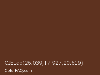 CIELab 26.039,17.927,20.619 Color is a dark orange color and the nearest color is Caput Mortuum #592720. Hex code #5e321f and RGB value is rgb(94,50,31). In RGB color space, this color is composed of 37% red, 20% green, 12% blue, In CMYK color space, this color is composed of 0% cyan, 47% magenta, 67% yellow , 63% black , In HSL color space, this color has a hue angle of 18° , 50% saturation and 25% lightness.