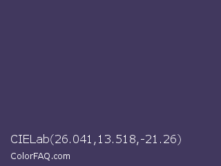 CIELab 26.041,13.518,-21.26 Color is a dark indigo color and the nearest color is Gun Powder #414257. Hex code #41385e and RGB value is rgb(65,56,94). In RGB color space, this color is composed of 25% red, 22% green, 37% blue, In CMYK color space, this color is composed of 31% cyan, 40% magenta, 0% yellow , 63% black , In HSL color space, this color has a hue angle of 254° , 25% saturation and 29% lightness.