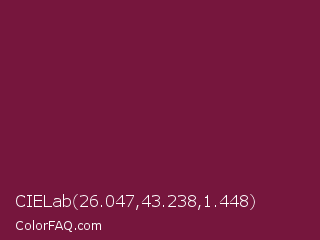 CIELab 26.047,43.238,1.448 Color is a dark rose color and the nearest color is Claret #7f1734. Hex code #76163d and RGB value is rgb(118,22,61). In RGB color space, this color is composed of 46% red, 9% green, 24% blue, In CMYK color space, this color is composed of 0% cyan, 81% magenta, 48% yellow , 54% black , In HSL color space, this color has a hue angle of 336° , 69% saturation and 27% lightness.