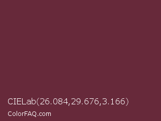 CIELab 26.084,29.676,3.166 Color is a dark rose color and the nearest color is Tawny Port #692545. Hex code #67293a and RGB value is rgb(103,41,58). In RGB color space, this color is composed of 40% red, 16% green, 23% blue, In CMYK color space, this color is composed of 0% cyan, 60% magenta, 44% yellow , 60% black , In HSL color space, this color has a hue angle of 344° , 43% saturation and 28% lightness.
