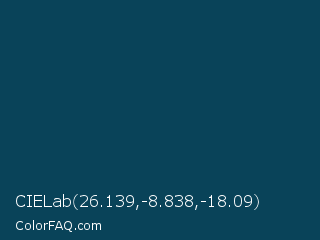 CIELab 26.139,-8.838,-18.09 Color is a very dark blue color and the nearest color is Teal Blue #044259. Hex code #094359 and RGB value is rgb(9,67,89). In RGB color space, this color is composed of 4% red, 26% green, 35% blue, In CMYK color space, this color is composed of 90% cyan, 25% magenta, 0% yellow , 65% black , In HSL color space, this color has a hue angle of 197° , 82% saturation and 19% lightness.