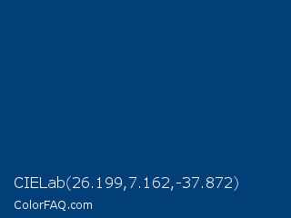 CIELab 26.199,7.162,-37.872 Color is a dark blue color and the nearest color is Dark Cerulean #08457e. Hex code #023e78 and RGB value is rgb(2,62,120). In RGB color space, this color is composed of 1% red, 24% green, 47% blue, In CMYK color space, this color is composed of 98% cyan, 48% magenta, 0% yellow , 53% black , In HSL color space, this color has a hue angle of 209° , 97% saturation and 24% lightness.