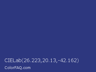 CIELab 26.223,20.13,-42.162 Color is a normal blue color and the nearest color is Bay Of Many #273a81. Hex code #2d377f and RGB value is rgb(45,55,127). In RGB color space, this color is composed of 18% red, 22% green, 50% blue, In CMYK color space, this color is composed of 65% cyan, 57% magenta, 0% yellow , 50% black , In HSL color space, this color has a hue angle of 233° , 48% saturation and 34% lightness.