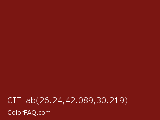CIELab 26.24,42.089,30.219 Color is a dark red color and the nearest color is UP Maroon #7b1113. Hex code #7b1612 and RGB value is rgb(123,22,18). In RGB color space, this color is composed of 48% red, 9% green, 7% blue, In CMYK color space, this color is composed of 0% cyan, 82% magenta, 85% yellow , 52% black , In HSL color space, this color has a hue angle of 2° , 74% saturation and 28% lightness.