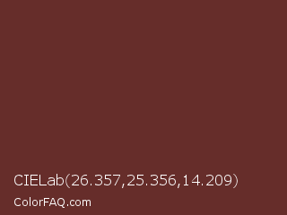 CIELab 26.357,25.356,14.209 Color is a dark red color and the nearest color is Buccaneer #622f30. Hex code #662d2a and RGB value is rgb(102,45,42). In RGB color space, this color is composed of 40% red, 18% green, 16% blue, In CMYK color space, this color is composed of 0% cyan, 56% magenta, 59% yellow , 60% black , In HSL color space, this color has a hue angle of 3° , 42% saturation and 28% lightness.