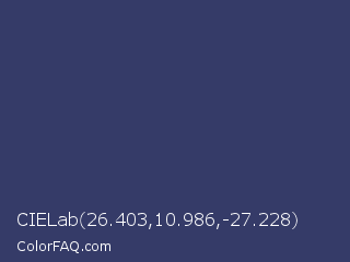CIELab 26.403,10.986,-27.228 Color is a normal blue color and the nearest color is Deep Koamaru #333366. Hex code #353b68 and RGB value is rgb(53,59,104). In RGB color space, this color is composed of 21% red, 23% green, 41% blue, In CMYK color space, this color is composed of 49% cyan, 43% magenta, 0% yellow , 59% black , In HSL color space, this color has a hue angle of 233° , 32% saturation and 31% lightness.