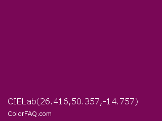 CIELab 26.416,50.357,-14.757 Color is a dark magenta color and the nearest color is French Plum #811453. Hex code #790756 and RGB value is rgb(121,7,86). In RGB color space, this color is composed of 47% red, 3% green, 34% blue, In CMYK color space, this color is composed of 0% cyan, 94% magenta, 29% yellow , 53% black , In HSL color space, this color has a hue angle of 318° , 89% saturation and 25% lightness.