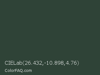 CIELab 26.432,-10.898,4.76 Color is a very dark green color and the nearest color is Kombu Green #354230. Hex code #2f4337 and RGB value is rgb(47,67,55). In RGB color space, this color is composed of 18% red, 26% green, 22% blue, In CMYK color space, this color is composed of 30% cyan, 0% magenta, 18% yellow , 74% black , In HSL color space, this color has a hue angle of 144° , 18% saturation and 22% lightness.