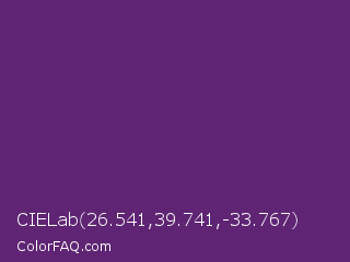 CIELab 26.541,39.741,-33.767 Color is a dark purple color and the nearest color is Imperial #602f6b. Hex code #5f2473 and RGB value is rgb(95,36,115). In RGB color space, this color is composed of 37% red, 14% green, 45% blue, In CMYK color space, this color is composed of 17% cyan, 69% magenta, 0% yellow , 55% black , In HSL color space, this color has a hue angle of 285° , 52% saturation and 30% lightness.