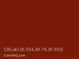 CIELab 26.554,39.79,35.653 Color is a dark red color and the nearest color is Kenyan Copper #7c1c05. Hex code #7a1b07 and RGB value is rgb(122,27,7). In RGB color space, this color is composed of 48% red, 11% green, 3% blue, In CMYK color space, this color is composed of 0% cyan, 78% magenta, 94% yellow , 52% black , In HSL color space, this color has a hue angle of 10° , 89% saturation and 25% lightness.