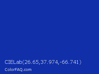 CIELab 26.65,37.974,-66.741 Color is a normal blue color and the nearest color is Egyptian Blue #1034a6. Hex code #102fa8 and RGB value is rgb(16,47,168). In RGB color space, this color is composed of 6% red, 18% green, 66% blue, In CMYK color space, this color is composed of 90% cyan, 72% magenta, 0% yellow , 34% black , In HSL color space, this color has a hue angle of 228° , 83% saturation and 36% lightness.