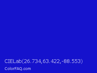 CIELab 26.734,63.422,-88.553 Color is a normal indigo color and the nearest color is Medium Blue #0000cd. Hex code #1512cd and RGB value is rgb(21,18,205). In RGB color space, this color is composed of 8% red, 7% green, 80% blue, In CMYK color space, this color is composed of 90% cyan, 91% magenta, 0% yellow , 20% black , In HSL color space, this color has a hue angle of 241° , 84% saturation and 44% lightness.