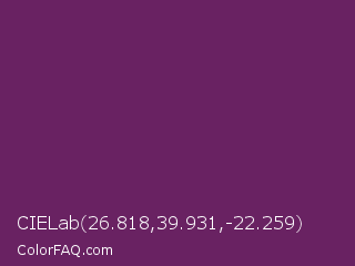 CIELab 26.818,39.931,-22.259 Color is a dark magenta color and the nearest color is Palatinate Purple #682860. Hex code #692262 and RGB value is rgb(105,34,98). In RGB color space, this color is composed of 41% red, 13% green, 38% blue, In CMYK color space, this color is composed of 0% cyan, 68% magenta, 7% yellow , 59% black , In HSL color space, this color has a hue angle of 306° , 51% saturation and 27% lightness.