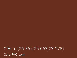 CIELab 26.865,25.063,23.278 Color is a dark red color and the nearest color is Liver Organ #6c2e1f. Hex code #692e1d and RGB value is rgb(105,46,29). In RGB color space, this color is composed of 41% red, 18% green, 11% blue, In CMYK color space, this color is composed of 0% cyan, 56% magenta, 72% yellow , 59% black , In HSL color space, this color has a hue angle of 13° , 57% saturation and 26% lightness.