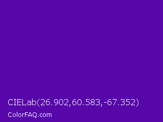 CIELab 26.902,60.583,-67.352 Color is a normal violet color and the nearest color is Purple #660099. Hex code #5706aa and RGB value is rgb(87,6,170). In RGB color space, this color is composed of 34% red, 2% green, 67% blue, In CMYK color space, this color is composed of 49% cyan, 96% magenta, 0% yellow , 33% black , In HSL color space, this color has a hue angle of 270° , 93% saturation and 35% lightness.