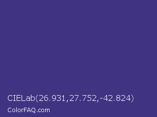 CIELab 26.931,27.752,-42.824 Color is a normal indigo color and the nearest color is Minsk #3f307f. Hex code #403382 and RGB value is rgb(64,51,130). In RGB color space, this color is composed of 25% red, 20% green, 51% blue, In CMYK color space, this color is composed of 51% cyan, 61% magenta, 0% yellow , 49% black , In HSL color space, this color has a hue angle of 250° , 44% saturation and 35% lightness.
