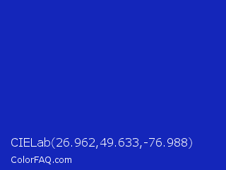 CIELab 26.962,49.633,-76.988 Color is a normal blue color and the nearest color is Persian Blue #1c39bb. Hex code #1426ba and RGB value is rgb(20,38,186). In RGB color space, this color is composed of 8% red, 15% green, 73% blue, In CMYK color space, this color is composed of 89% cyan, 80% magenta, 0% yellow , 27% black , In HSL color space, this color has a hue angle of 233° , 81% saturation and 40% lightness.