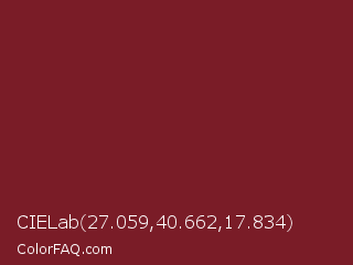 CIELab 27.059,40.662,17.834 Color is a dark red color and the nearest color is Crown Of Thorns #771f1f. Hex code #7a1c27 and RGB value is rgb(122,28,39). In RGB color space, this color is composed of 48% red, 11% green, 15% blue, In CMYK color space, this color is composed of 0% cyan, 77% magenta, 68% yellow , 52% black , In HSL color space, this color has a hue angle of 353° , 63% saturation and 29% lightness.