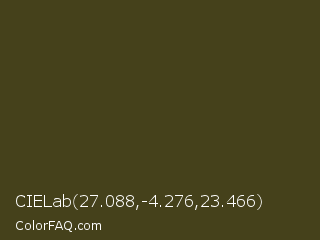 CIELab 27.088,-4.276,23.466 Color is a very dark yellow color and the nearest color is Thatch Green #403d19. Hex code #45411b and RGB value is rgb(69,65,27). In RGB color space, this color is composed of 27% red, 25% green, 11% blue, In CMYK color space, this color is composed of 0% cyan, 6% magenta, 61% yellow , 73% black , In HSL color space, this color has a hue angle of 54° , 44% saturation and 19% lightness.