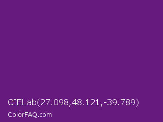 CIELab 27.098,48.121,-39.789 Color is a dark purple color and the nearest color is Midnight #702670. Hex code #671a7e and RGB value is rgb(103,26,126). In RGB color space, this color is composed of 40% red, 10% green, 49% blue, In CMYK color space, this color is composed of 18% cyan, 79% magenta, 0% yellow , 51% black , In HSL color space, this color has a hue angle of 286° , 66% saturation and 30% lightness.