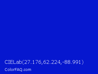 CIELab 27.176,62.224,-88.991 Color is a normal blue color and the nearest color is Medium Blue #0000cd. Hex code #0617cf and RGB value is rgb(6,23,207). In RGB color space, this color is composed of 2% red, 9% green, 81% blue, In CMYK color space, this color is composed of 97% cyan, 89% magenta, 0% yellow , 19% black , In HSL color space, this color has a hue angle of 235° , 94% saturation and 42% lightness.
