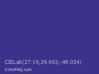 CIELab 27.19,29.693,-48.034 Color is a normal indigo color and the nearest color is Minsk #3f307f. Hex code #3b338b and RGB value is rgb(59,51,139). In RGB color space, this color is composed of 23% red, 20% green, 55% blue, In CMYK color space, this color is composed of 58% cyan, 63% magenta, 0% yellow , 45% black , In HSL color space, this color has a hue angle of 245° , 46% saturation and 37% lightness.