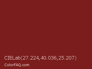 CIELab 27.224,40.036,25.207 Color is a dark red color and the nearest color is Crown Of Thorns #771f1f. Hex code #7b1d1c and RGB value is rgb(123,29,28). In RGB color space, this color is composed of 48% red, 11% green, 11% blue, In CMYK color space, this color is composed of 0% cyan, 76% magenta, 77% yellow , 52% black , In HSL color space, this color has a hue angle of 1° , 63% saturation and 30% lightness.
