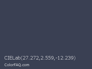 CIELab 27.272,2.559,-12.239 Color is a dark blue color and the nearest color is Bright Gray #3c4151. Hex code #3a4053 and RGB value is rgb(58,64,83). In RGB color space, this color is composed of 23% red, 25% green, 33% blue, In CMYK color space, this color is composed of 30% cyan, 23% magenta, 0% yellow , 67% black , In HSL color space, this color has a hue angle of 226° , 18% saturation and 28% lightness.