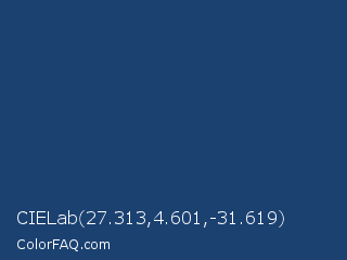 CIELab 27.313,4.601,-31.619 Color is a dark blue color and the nearest color is Astronaut #283a77. Hex code #1b4171 and RGB value is rgb(27,65,113). In RGB color space, this color is composed of 11% red, 25% green, 44% blue, In CMYK color space, this color is composed of 76% cyan, 42% magenta, 0% yellow , 56% black , In HSL color space, this color has a hue angle of 213° , 61% saturation and 27% lightness.
