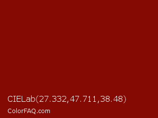 CIELab 27.332,47.711,38.48 Color is a dark red color and the nearest color is Barn Red #7c0a02. Hex code #850a04 and RGB value is rgb(133,10,4). In RGB color space, this color is composed of 52% red, 4% green, 2% blue, In CMYK color space, this color is composed of 0% cyan, 92% magenta, 97% yellow , 48% black , In HSL color space, this color has a hue angle of 3° , 94% saturation and 27% lightness.