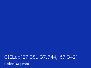 CIELab 27.381,37.744,-67.342 Color is a normal blue color and the nearest color is Egyptian Blue #1034a6. Hex code #0e31ab and RGB value is rgb(14,49,171). In RGB color space, this color is composed of 5% red, 19% green, 67% blue, In CMYK color space, this color is composed of 92% cyan, 71% magenta, 0% yellow , 33% black , In HSL color space, this color has a hue angle of 227° , 85% saturation and 36% lightness.