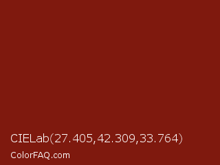 CIELab 27.405,42.309,33.764 Color is a dark red color and the nearest color is Kenyan Copper #7c1c05. Hex code #7f190e and RGB value is rgb(127,25,14). In RGB color space, this color is composed of 50% red, 10% green, 5% blue, In CMYK color space, this color is composed of 0% cyan, 80% magenta, 89% yellow , 50% black , In HSL color space, this color has a hue angle of 6° , 80% saturation and 28% lightness.