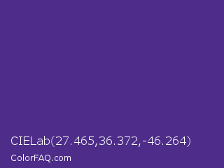 CIELab 27.465,36.372,-46.264 Color is a normal violet color and the nearest color is KSU Purple #512888. Hex code #4d2d89 and RGB value is rgb(77,45,137). In RGB color space, this color is composed of 30% red, 18% green, 54% blue, In CMYK color space, this color is composed of 44% cyan, 67% magenta, 0% yellow , 46% black , In HSL color space, this color has a hue angle of 261° , 51% saturation and 36% lightness.