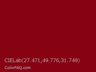 CIELab 27.471,49.776,31.749 Color is a dark red color and the nearest color is Red Devil #860111. Hex code #870313 and RGB value is rgb(135,3,19). In RGB color space, this color is composed of 53% red, 1% green, 7% blue, In CMYK color space, this color is composed of 0% cyan, 98% magenta, 86% yellow , 47% black , In HSL color space, this color has a hue angle of 353° , 96% saturation and 27% lightness.