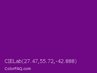 CIELab 27.47,55.72,-42.888 Color is a dark purple color and the nearest color is Patriarch #800080. Hex code #700784 and RGB value is rgb(112,7,132). In RGB color space, this color is composed of 44% red, 3% green, 52% blue, In CMYK color space, this color is composed of 15% cyan, 95% magenta, 0% yellow , 48% black , In HSL color space, this color has a hue angle of 290° , 90% saturation and 27% lightness.