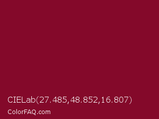 CIELab 27.485,48.852,16.807 Color is a dark rose color and the nearest color is Monarch #8b0723. Hex code #84092a and RGB value is rgb(132,9,42). In RGB color space, this color is composed of 52% red, 4% green, 16% blue, In CMYK color space, this color is composed of 0% cyan, 93% magenta, 68% yellow , 48% black , In HSL color space, this color has a hue angle of 344° , 87% saturation and 28% lightness.