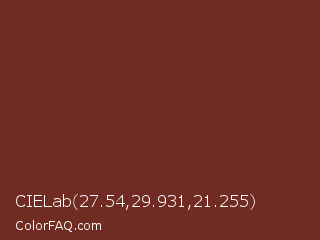 CIELab 27.54,29.931,21.255 Color is a dark red color and the nearest color is Metallic Copper #71291d. Hex code #702b22 and RGB value is rgb(112,43,34). In RGB color space, this color is composed of 44% red, 17% green, 13% blue, In CMYK color space, this color is composed of 0% cyan, 62% magenta, 70% yellow , 56% black , In HSL color space, this color has a hue angle of 7° , 53% saturation and 29% lightness.