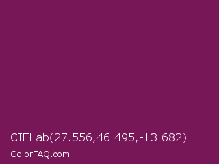 CIELab 27.556,46.495,-13.682 Color is a dark magenta color and the nearest color is French Plum #811453. Hex code #781757 and RGB value is rgb(120,23,87). In RGB color space, this color is composed of 47% red, 9% green, 34% blue, In CMYK color space, this color is composed of 0% cyan, 81% magenta, 28% yellow , 53% black , In HSL color space, this color has a hue angle of 320° , 68% saturation and 28% lightness.