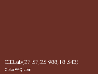 CIELab 27.57,25.988,18.543 Color is a dark red color and the nearest color is Liver Organ #6c2e1f. Hex code #6b2f26 and RGB value is rgb(107,47,38). In RGB color space, this color is composed of 42% red, 18% green, 15% blue, In CMYK color space, this color is composed of 0% cyan, 56% magenta, 64% yellow , 58% black , In HSL color space, this color has a hue angle of 8° , 48% saturation and 28% lightness.