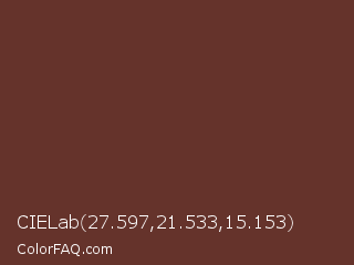CIELab 27.597,21.533,15.153 Color is a dark red color and the nearest color is Buccaneer #622f30. Hex code #65332b and RGB value is rgb(101,51,43). In RGB color space, this color is composed of 40% red, 20% green, 17% blue, In CMYK color space, this color is composed of 0% cyan, 50% magenta, 57% yellow , 60% black , In HSL color space, this color has a hue angle of 8° , 40% saturation and 28% lightness.