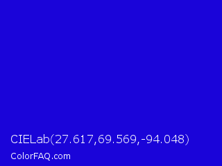 CIELab 27.617,69.569,-94.048 Color is a normal indigo color and the nearest color is Medium Blue #0000cd. Hex code #1a04d9 and RGB value is rgb(26,4,217). In RGB color space, this color is composed of 10% red, 2% green, 85% blue, In CMYK color space, this color is composed of 88% cyan, 98% magenta, 0% yellow , 15% black , In HSL color space, this color has a hue angle of 246° , 96% saturation and 43% lightness.