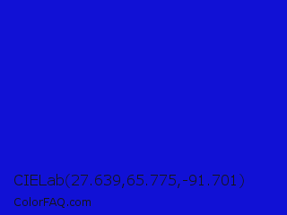 CIELab 27.639,65.775,-91.701 Color is a normal blue color and the nearest color is Medium Blue #0000cd. Hex code #1111d5 and RGB value is rgb(17,17,213). In RGB color space, this color is composed of 7% red, 7% green, 84% blue, In CMYK color space, this color is composed of 92% cyan, 92% magenta, 0% yellow , 16% black , In HSL color space, this color has a hue angle of 240° , 85% saturation and 45% lightness.