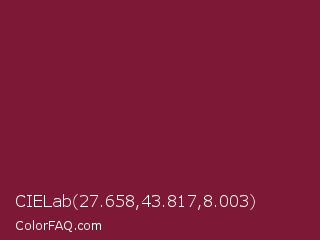 CIELab 27.658,43.817,8.003 Color is a dark rose color and the nearest color is Claret #7f1734. Hex code #7d1937 and RGB value is rgb(125,25,55). In RGB color space, this color is composed of 49% red, 10% green, 22% blue, In CMYK color space, this color is composed of 0% cyan, 80% magenta, 56% yellow , 51% black , In HSL color space, this color has a hue angle of 342° , 67% saturation and 29% lightness.