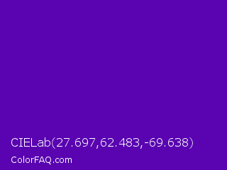 CIELab 27.697,62.483,-69.638 Color is a normal violet color and the nearest color is Purple #660099. Hex code #5904b0 and RGB value is rgb(89,4,176). In RGB color space, this color is composed of 35% red, 2% green, 69% blue, In CMYK color space, this color is composed of 49% cyan, 98% magenta, 0% yellow , 31% black , In HSL color space, this color has a hue angle of 270° , 96% saturation and 35% lightness.