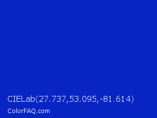 CIELab 27.737,53.095,-81.614 Color is a normal blue color and the nearest color is Persian Blue #1c39bb. Hex code #0825c4 and RGB value is rgb(8,37,196). In RGB color space, this color is composed of 3% red, 15% green, 77% blue, In CMYK color space, this color is composed of 96% cyan, 81% magenta, 0% yellow , 23% black , In HSL color space, this color has a hue angle of 231° , 92% saturation and 40% lightness.