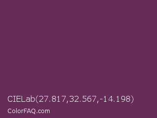 CIELab 27.817,32.567,-14.198 Color is a dark magenta color and the nearest color is Finn #692d54. Hex code #672c58 and RGB value is rgb(103,44,88). In RGB color space, this color is composed of 40% red, 17% green, 35% blue, In CMYK color space, this color is composed of 0% cyan, 57% magenta, 15% yellow , 60% black , In HSL color space, this color has a hue angle of 315° , 40% saturation and 29% lightness.