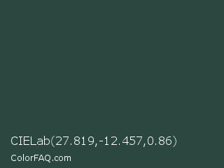 CIELab 27.819,-12.457,0.86 Color is a very dark cyan color and the nearest color is Japanese Indigo #264348. Hex code #2b4740 and RGB value is rgb(43,71,64). In RGB color space, this color is composed of 17% red, 28% green, 25% blue, In CMYK color space, this color is composed of 39% cyan, 0% magenta, 10% yellow , 72% black , In HSL color space, this color has a hue angle of 165° , 25% saturation and 22% lightness.